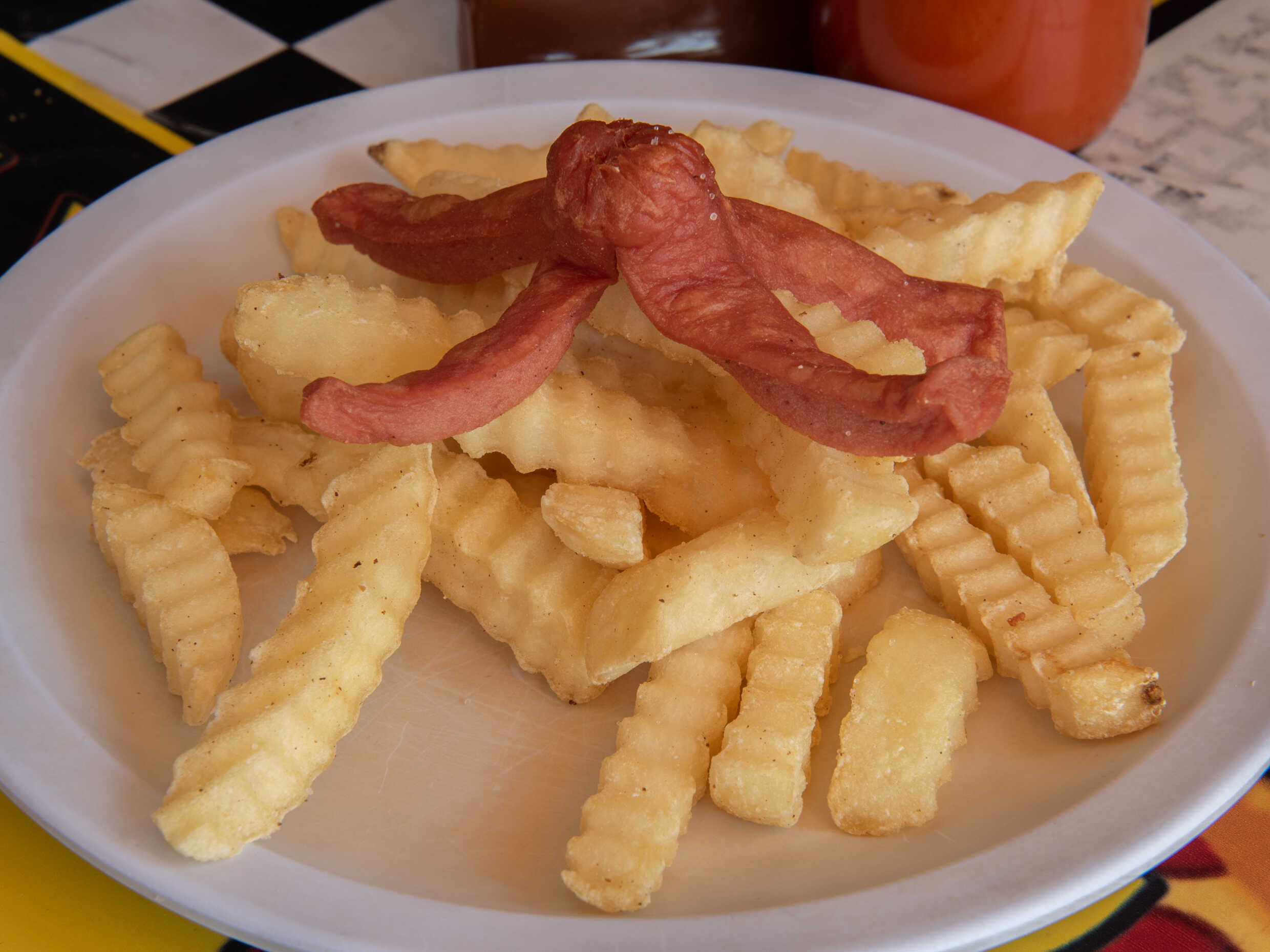 250 gr de papas con una salchipulpo y aderezos empaquetados