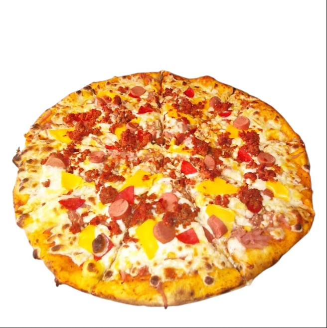 Jamón, pepperoni, salchicha, queso amarillo, chorizo y queso premium