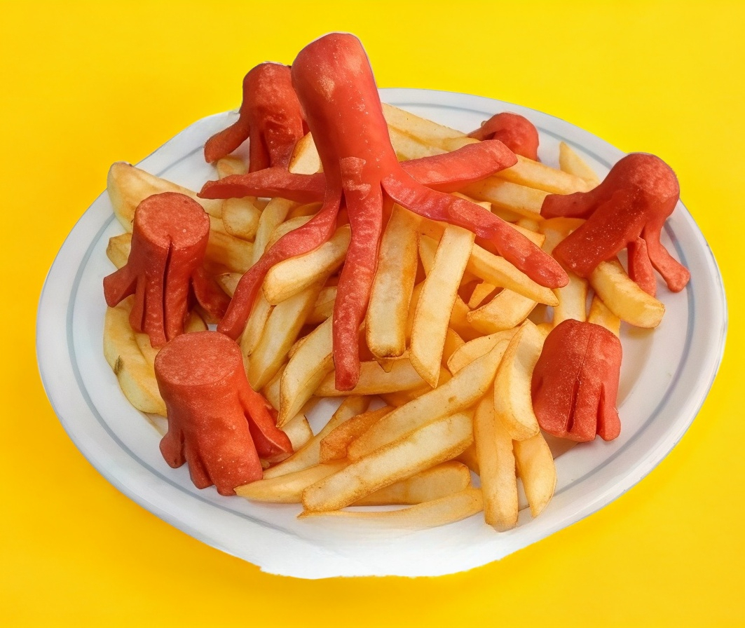 Salchicha, tocino, queso oaxaca, piña, chiles toreados en jugo maggi.