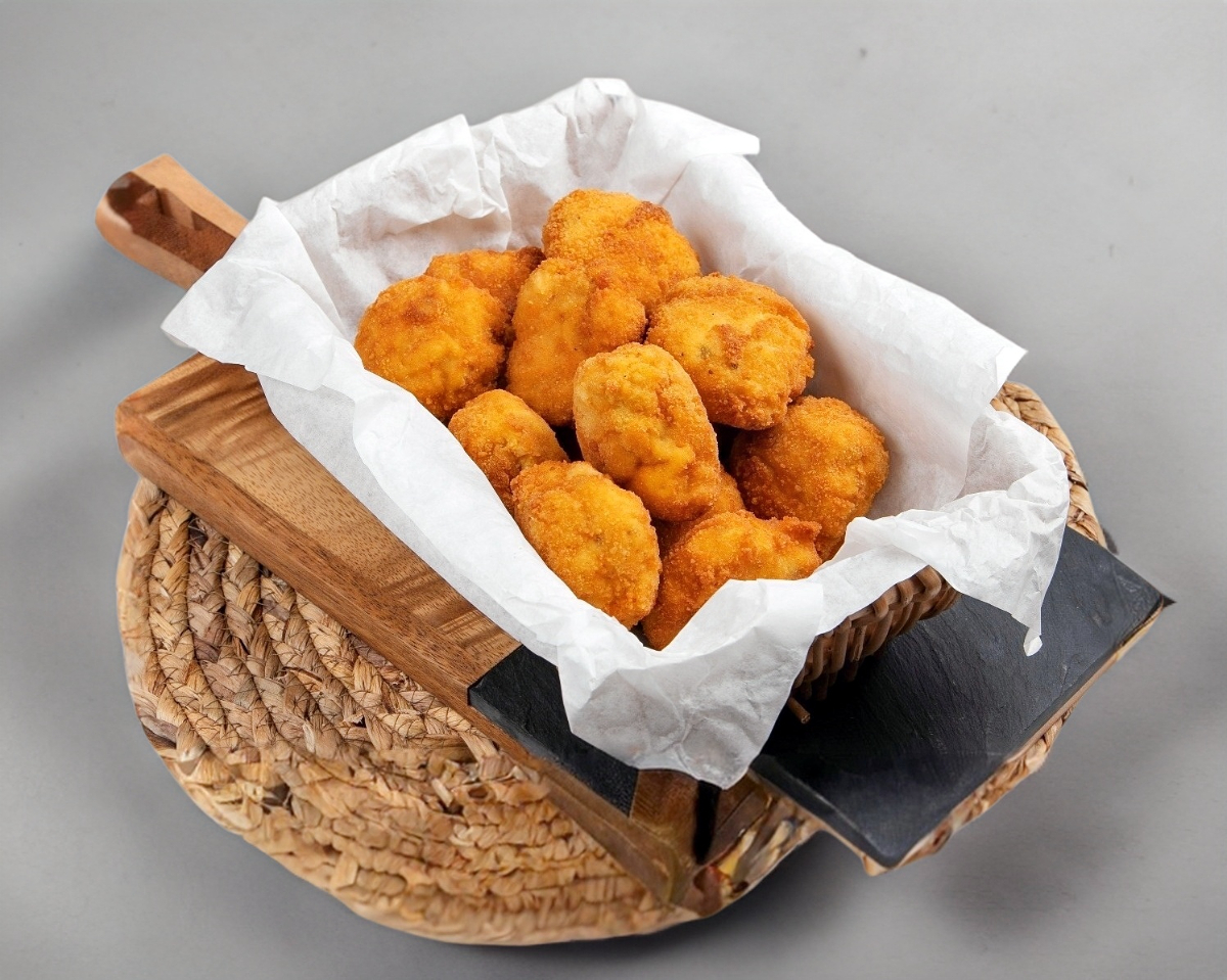 Bocados de pollo empanizado, suaves por dentro y crujientes por fuera, 10 piezas.