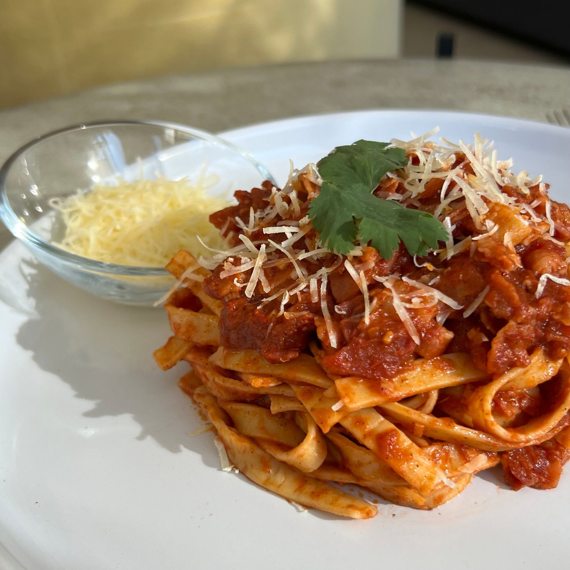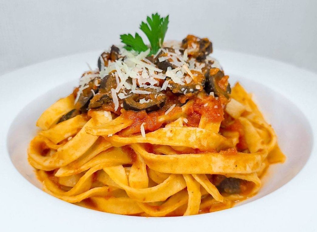 Salsa pomodoro, con sofrito en aceite de oliva de jalapeño, ajo, aceitunas negras y champiñones terminada con parmesano (400g)