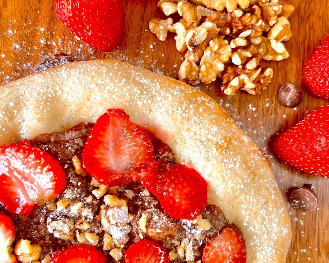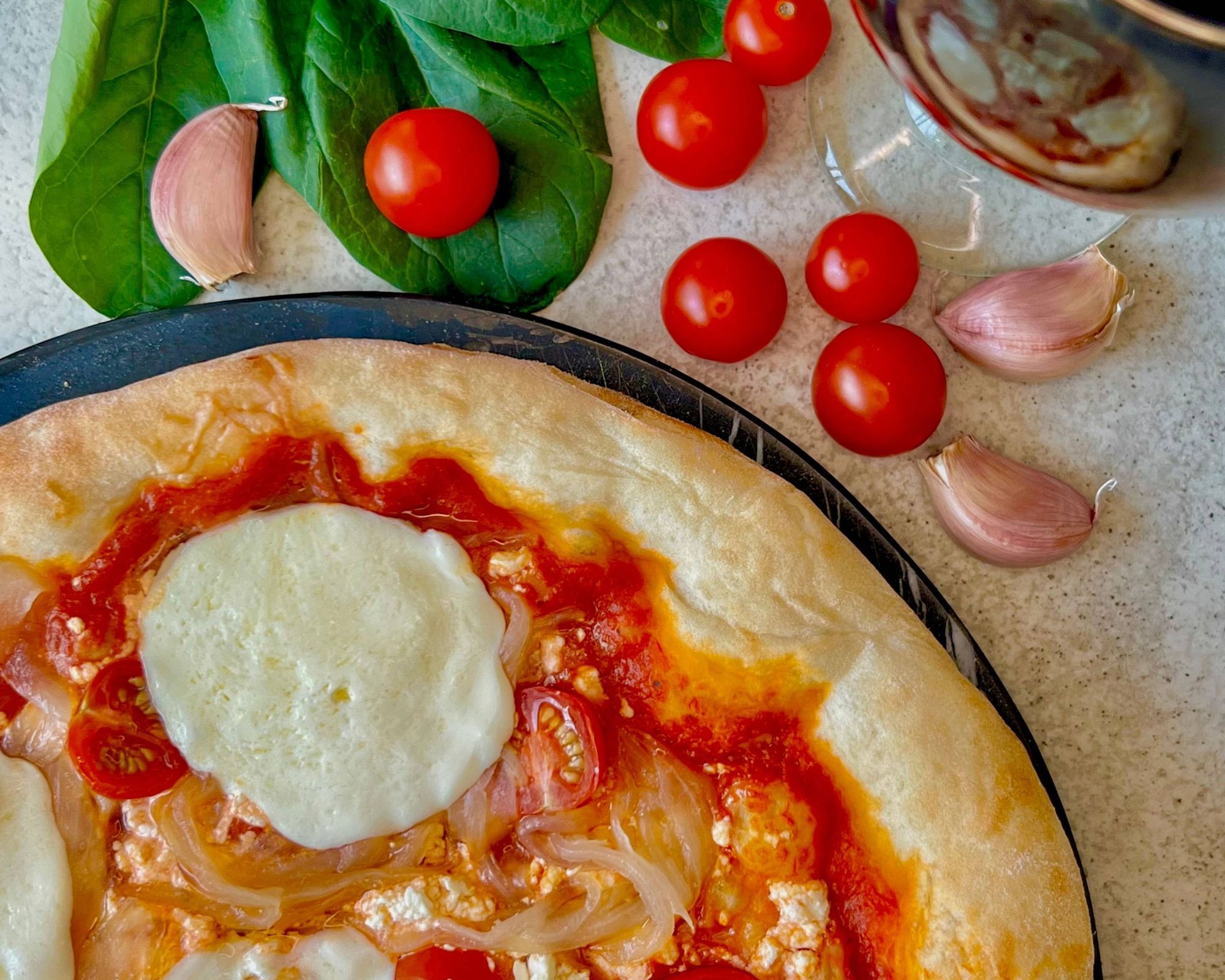 mozzarella bola, queso de cabra, cebolla caramelizada, jitomate cherry y aceite de oliva, 30cm