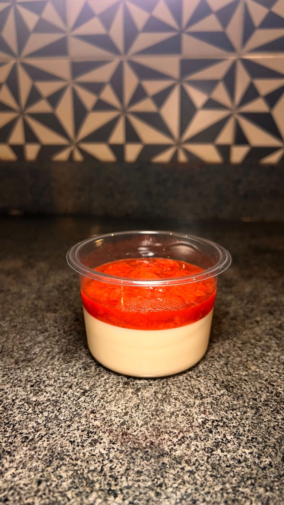 Postre Italiano a base de crema de leche acompañado con mermelada de fresa