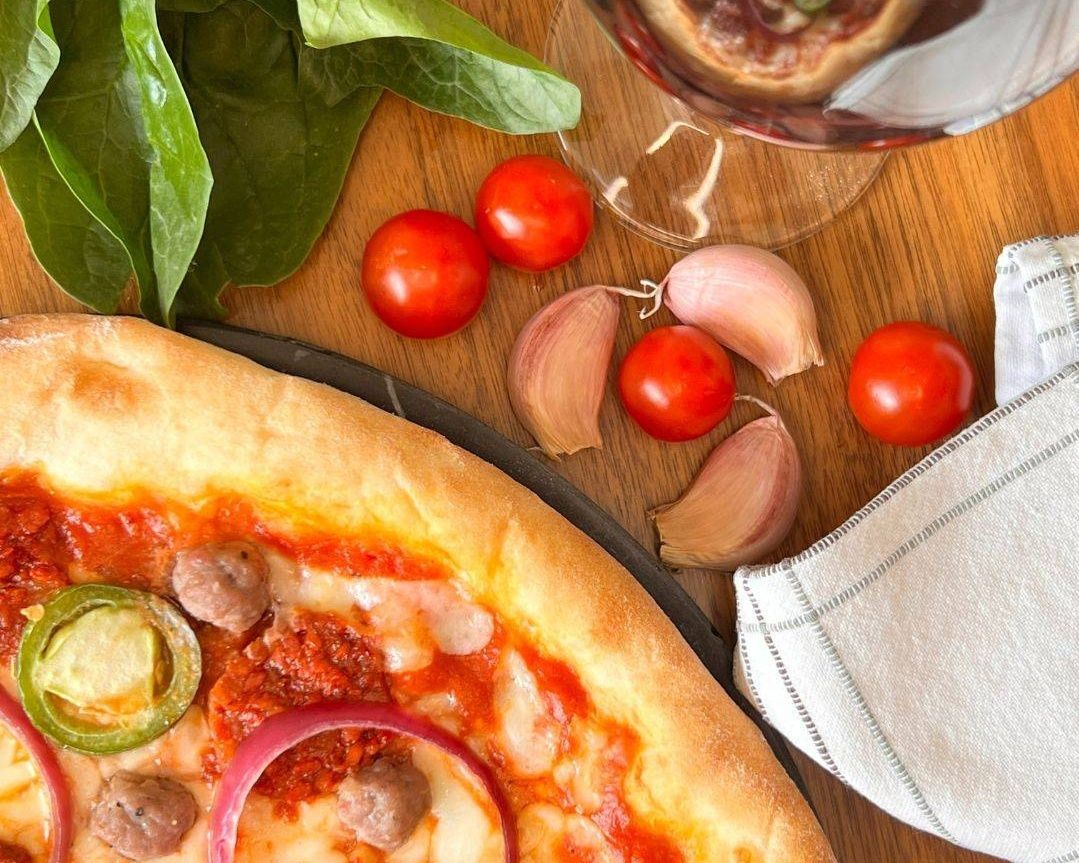 mozzarella, champiñones, cebolla morada, aceitunas negras, arúgula y aceite de oliva, 20cm