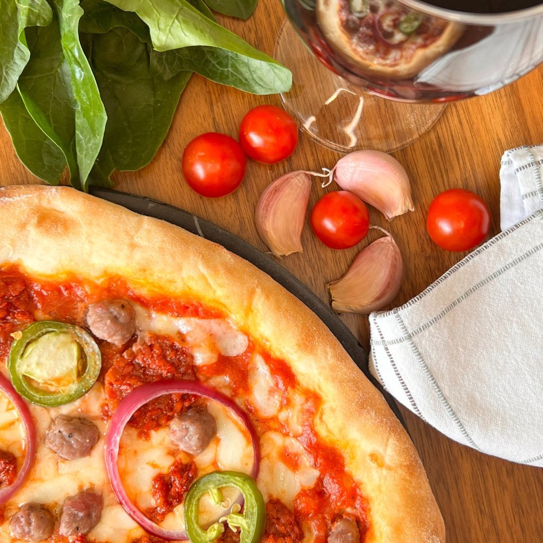 mozzarella, chorizo rojo, jalapeño, cebolla morada y bolitas de carne. 20cm
