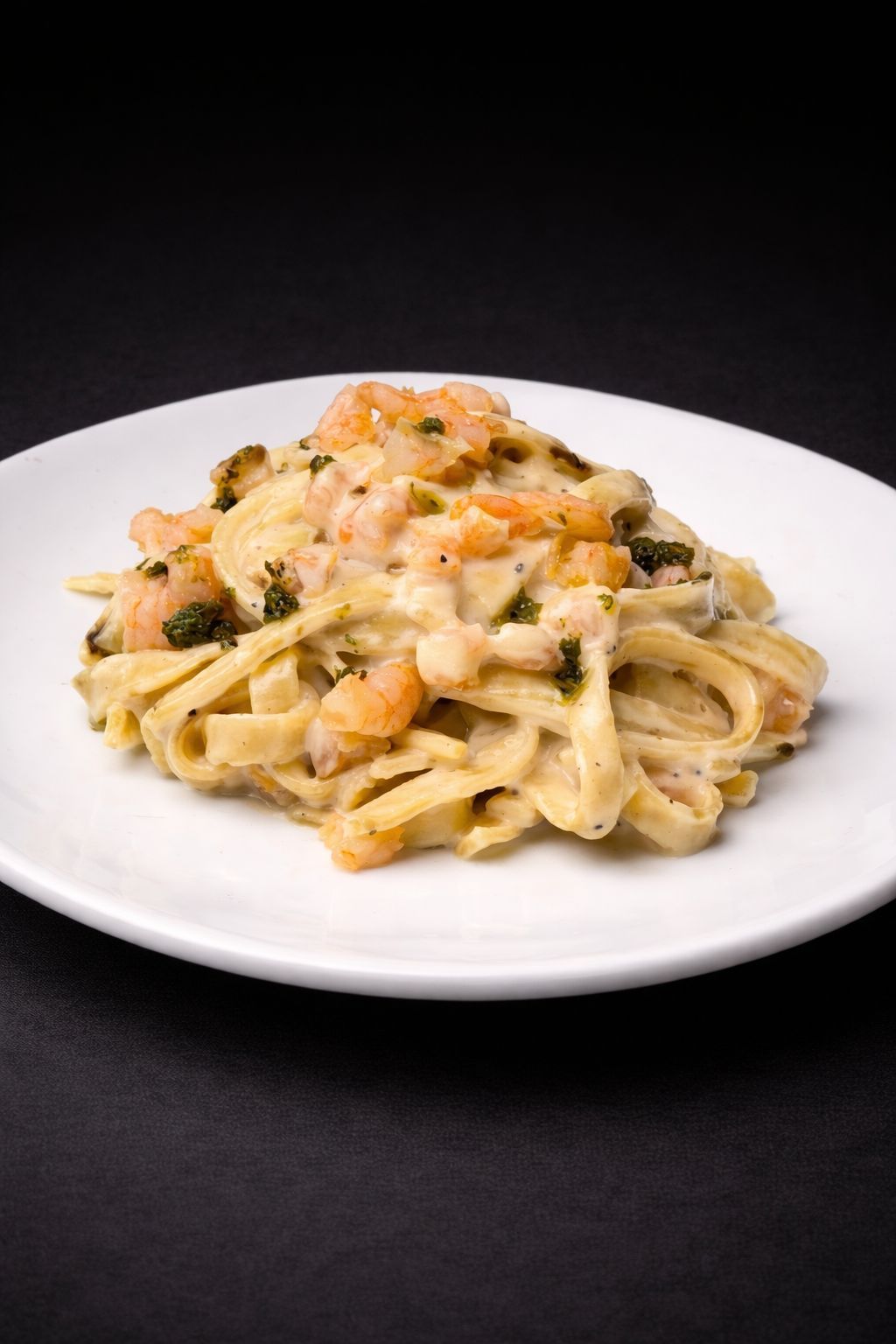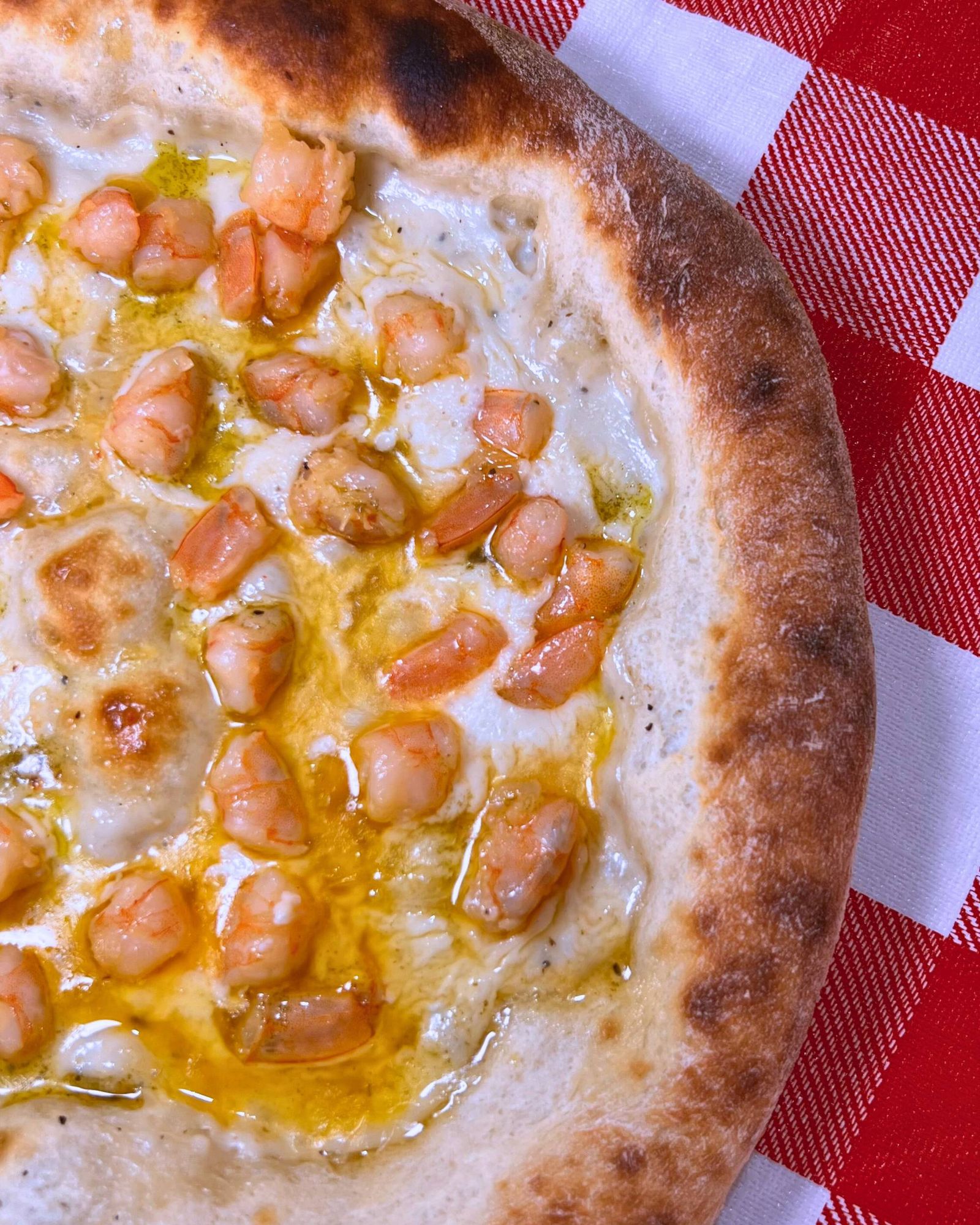Base bechamel con camarones a la mantequilla, parmesano rallado y un toque de pesto