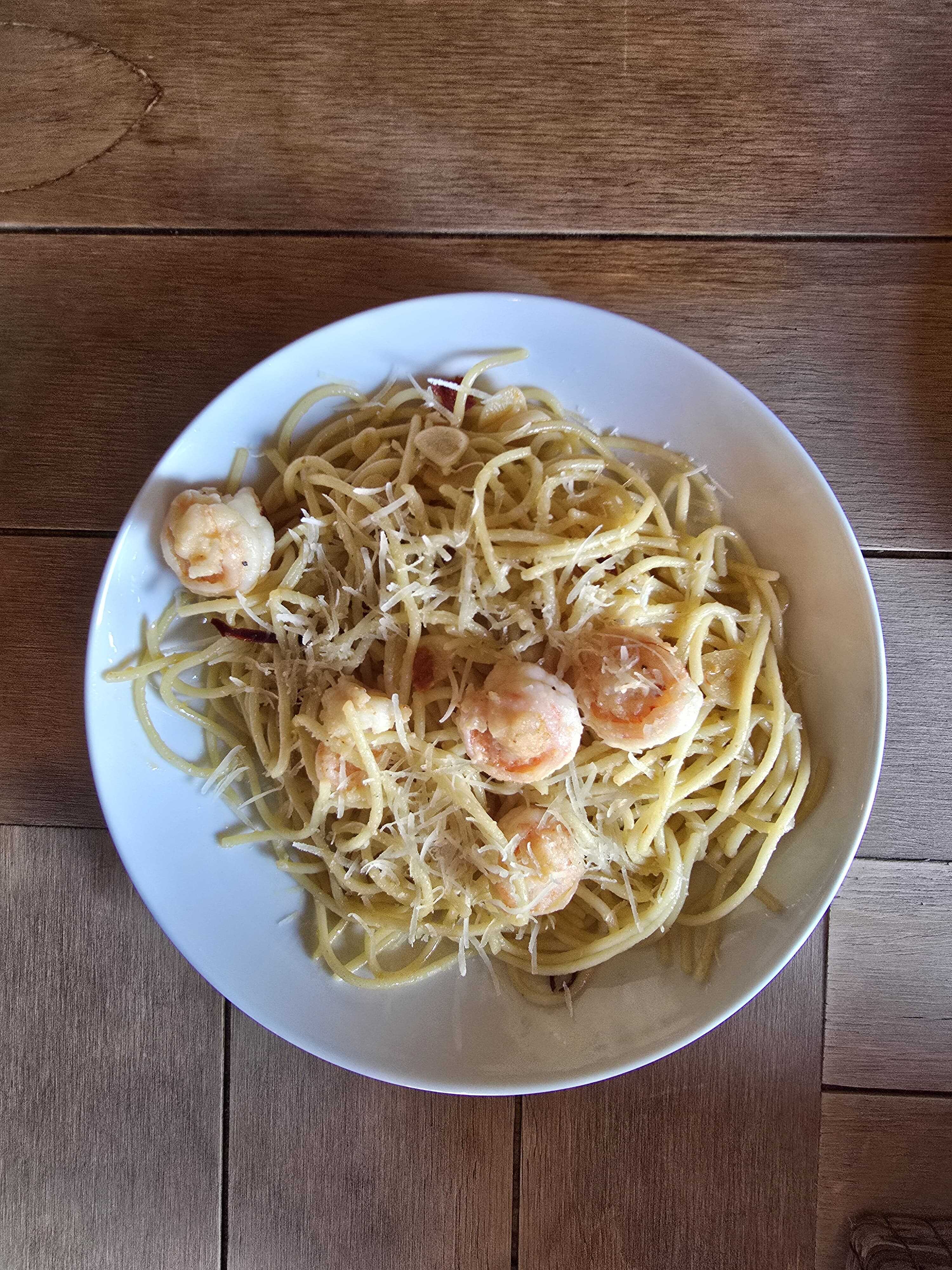 200 g De espagueti con camarones salteados con mantequilla con ajo fileteado, rodajas de chile de árbol y guajillo, servida con queso parmesano.