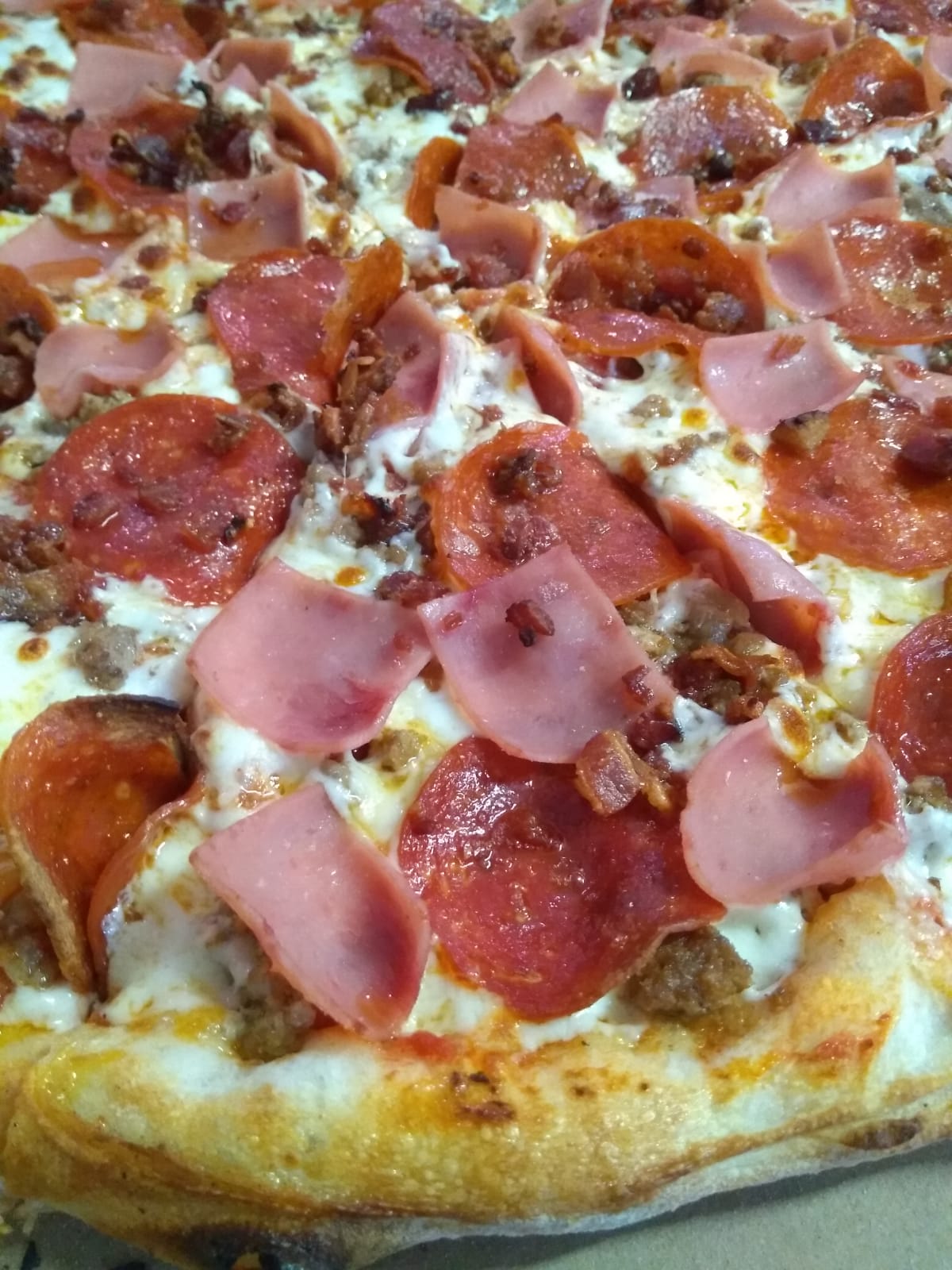 Carne molida, pepperoni, jamón y tocino ahumado.