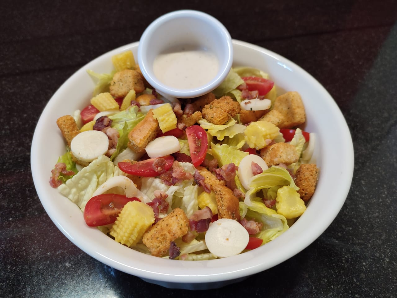 Mix de lechugas, palmitos, elotito baby, jitomate cherry, trocitos de tocino ahumado y crutones, con aderezo césar.