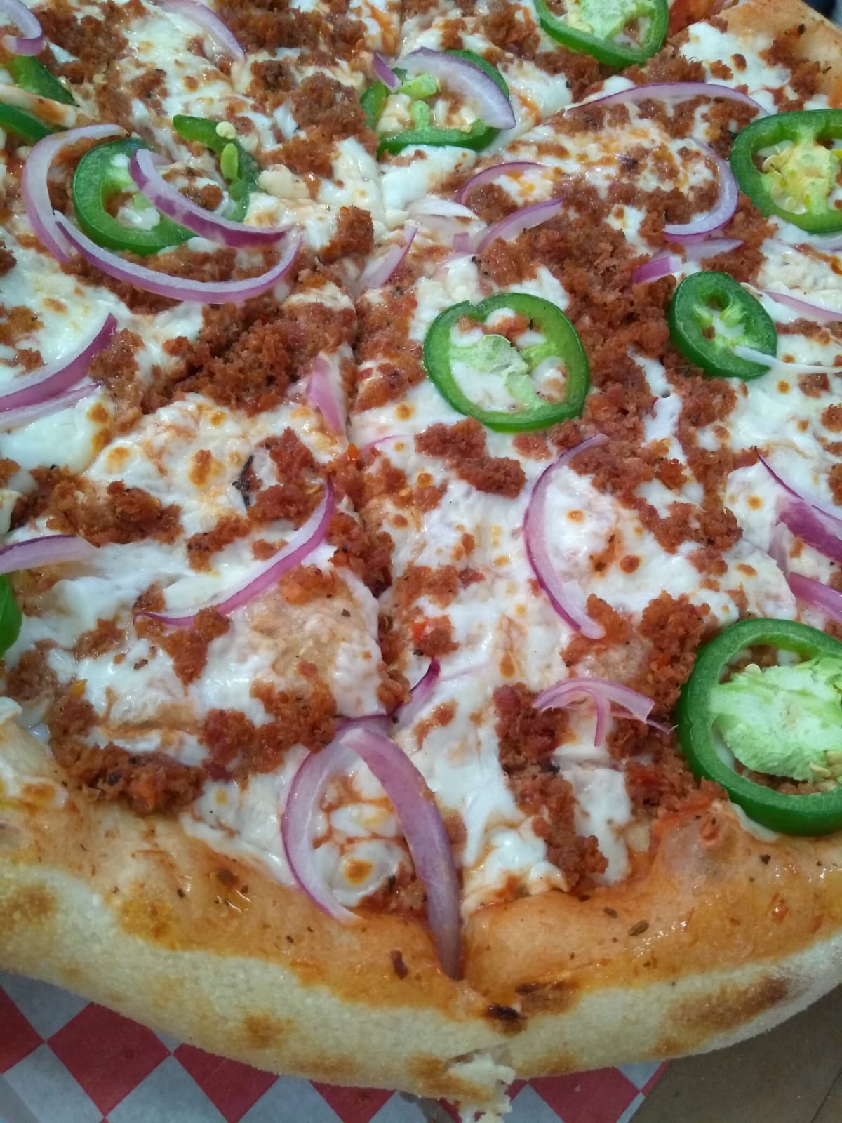 Carne molida, pepperoni, jamón, champiñones, pimientos, aceitunas negras y cebolla morada.