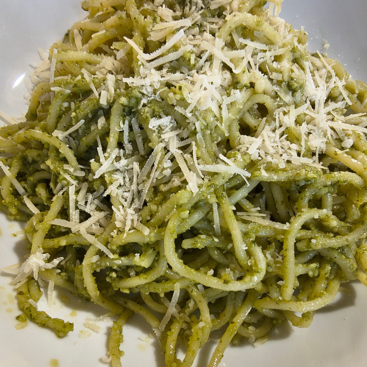 200 g De espagueti con pesto de albahaca, servida con queso parmesano.