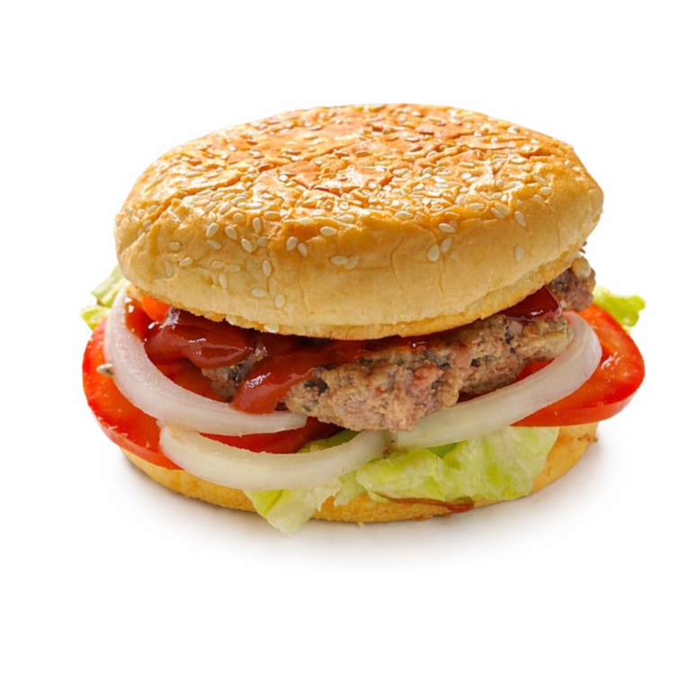 Pan, carne de res, lechuga, jitomate, cebolla, catsup y mayonesa.