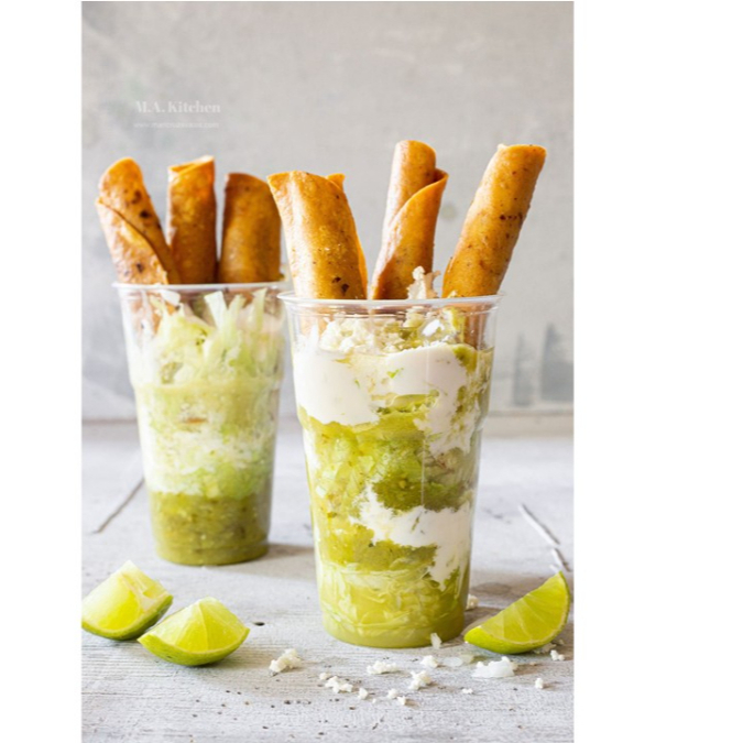 3 tacos dorados de pollo con lechuga, crema y deliciosa salsa roja.