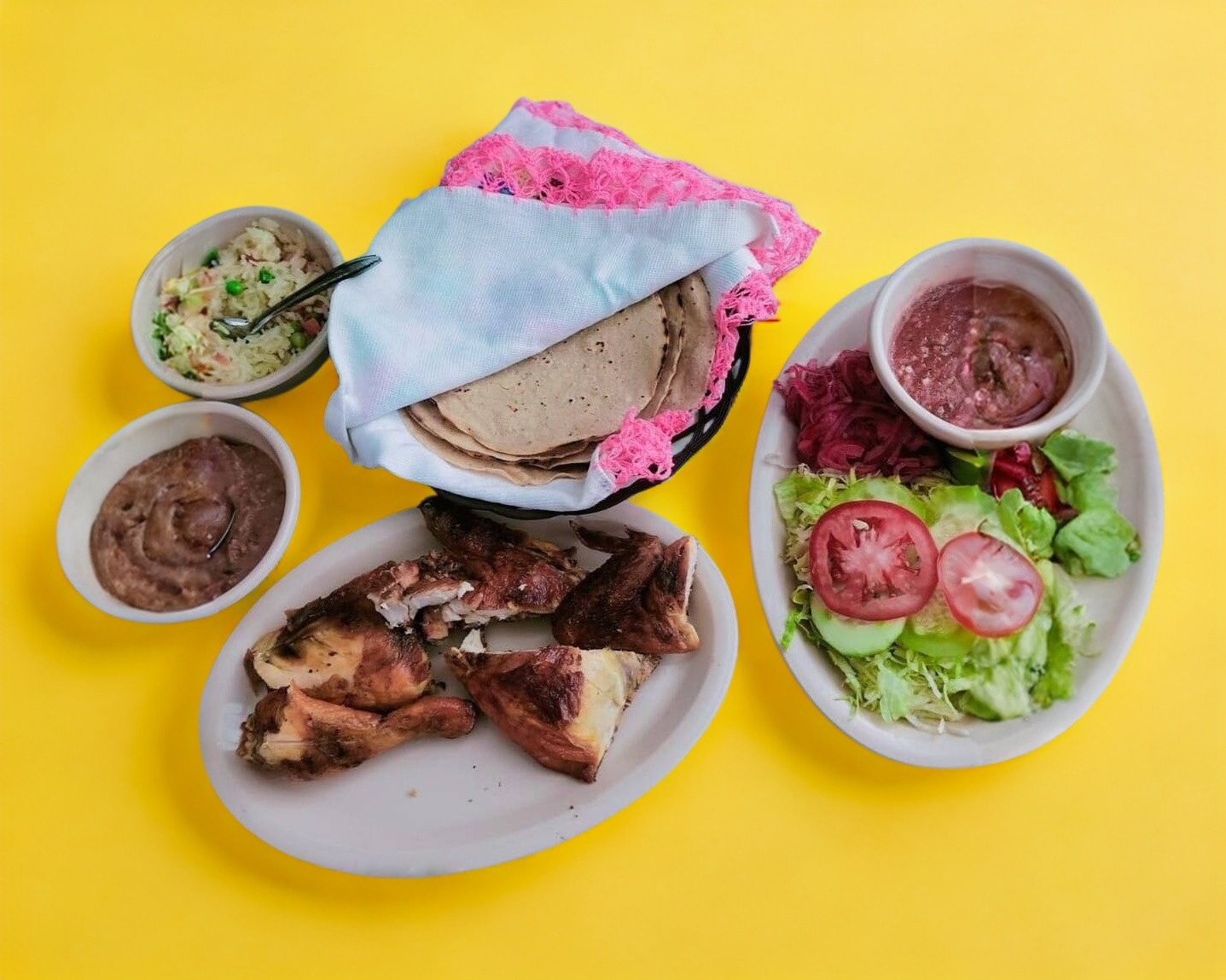 Delicioso pollo asado al carbón estilo Sinaloa acompañado de tortillas hechas a mano, ensalada, frijoles de la olla, arroz y salsas.