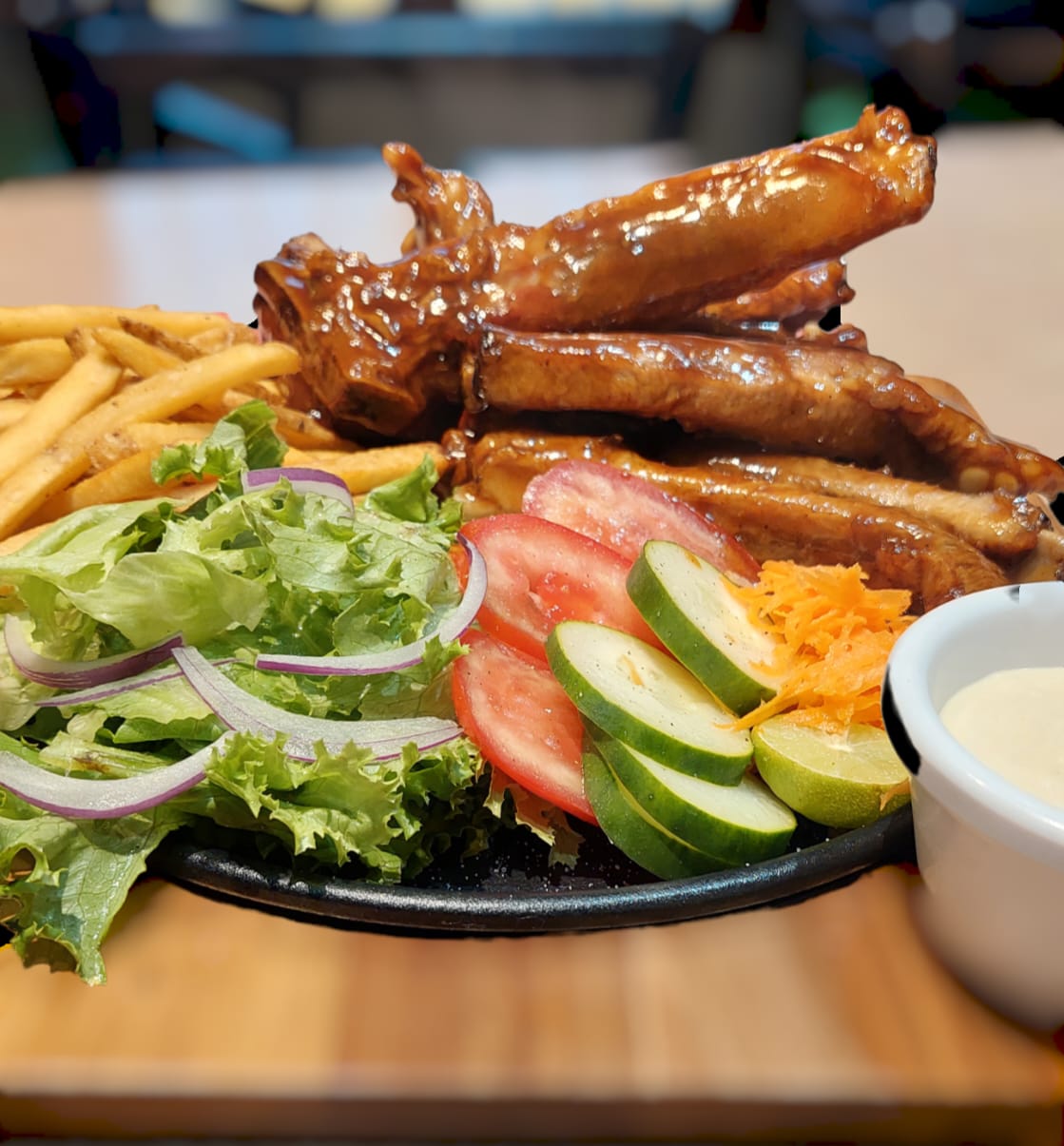 Deliciosas Costilla al horno, bañadas en salsa BBQ, acompañadas con Ensalada y papás a la francesa