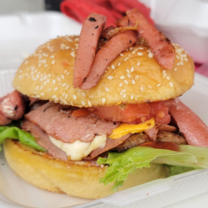 Deliciosa hambuerguesa de carne de res con, jamon, queso amarillo, salchicha y lechuga