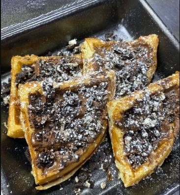 Waffle con nutella decorada con galletas Oreo troceadas.