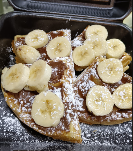 Waffle con Nutella decorada con galletas Oreo troceadas.