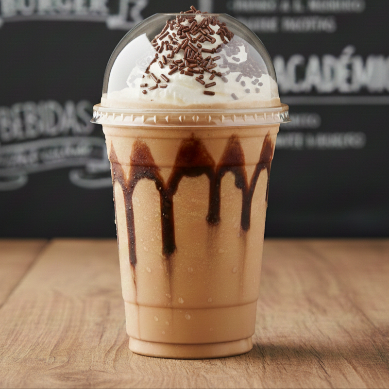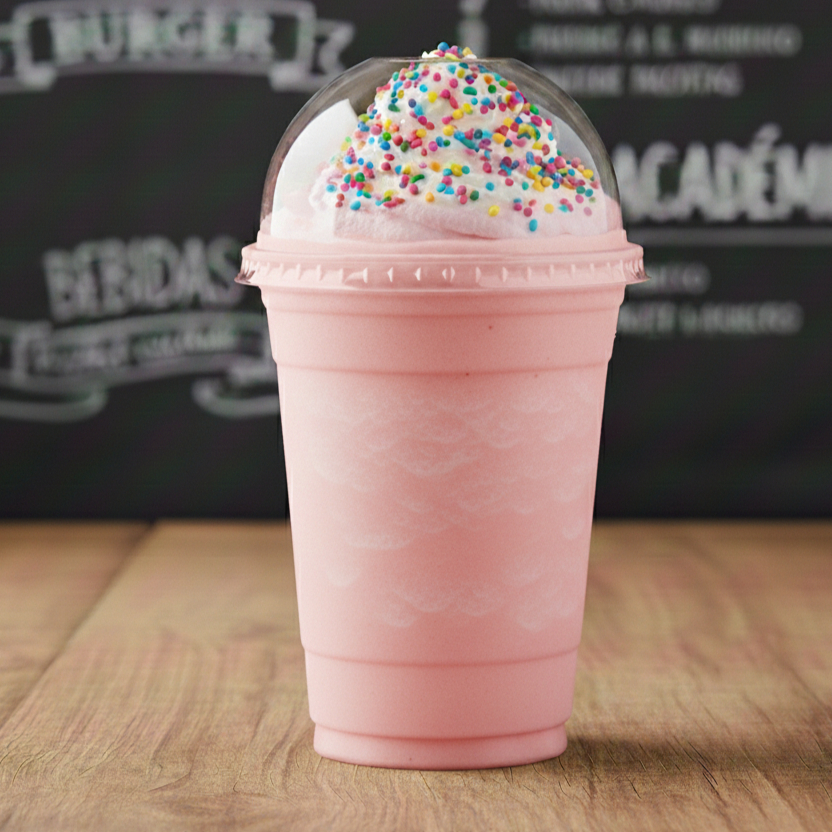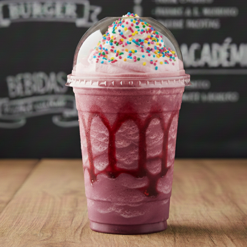 El sabor clásico que te encanta! 🥤 Frappé de fresa ultra cremoso, decorado con delicioso jarabe de fresa en las paredes del vaso. Coronido con una suave montaña de crema chantilly y una lluvia de chispitas de colores. ¡Dulce, refrescante y perfecto para tu recreo!