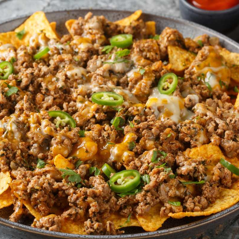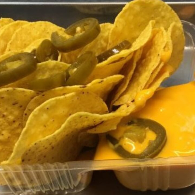 Nachos tradicionales bañados en queso, acompañados de jalapeños