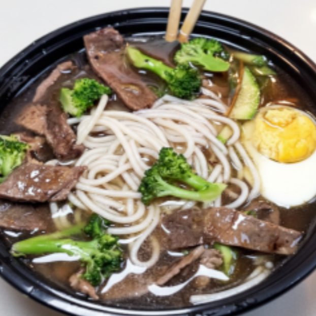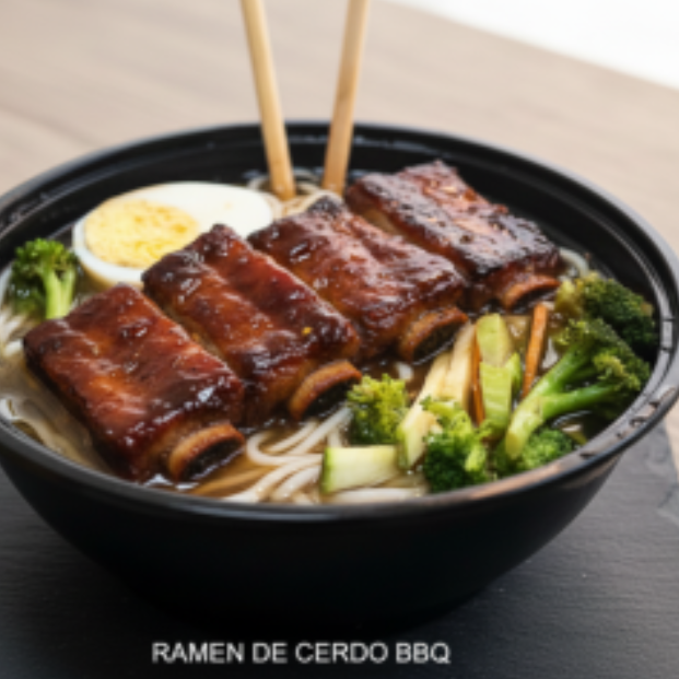 250 g De fideos, 5 pzas de costillas a la BBQ, medio huevo cocido, brocoli, apio, calabaza, zanahoria, cebolla y fondo especial de la casa.