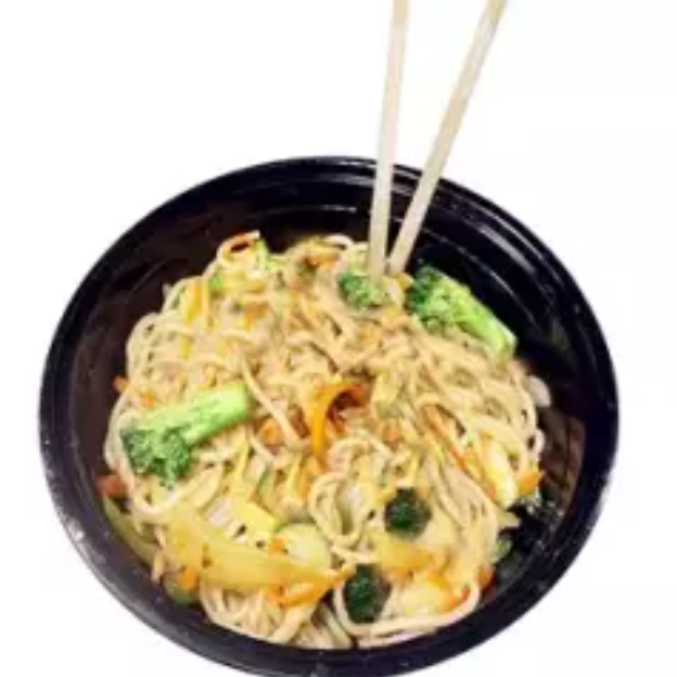 300 g De fideo salteado al wok, sin fondo, 8 pzas de chicken balls con brócoli, apio, zanahoria, calabaza y cebolla.