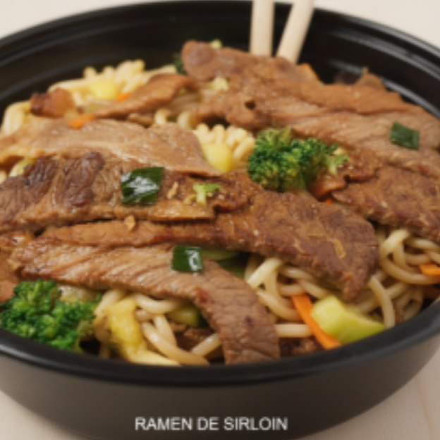 300 g De fideo salteado al wok, sin fondo, 100 g de sirloin corte fino (peso crudo) con brócoli, apio, zanahoria, calabaza y cebolla.
