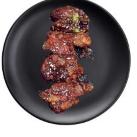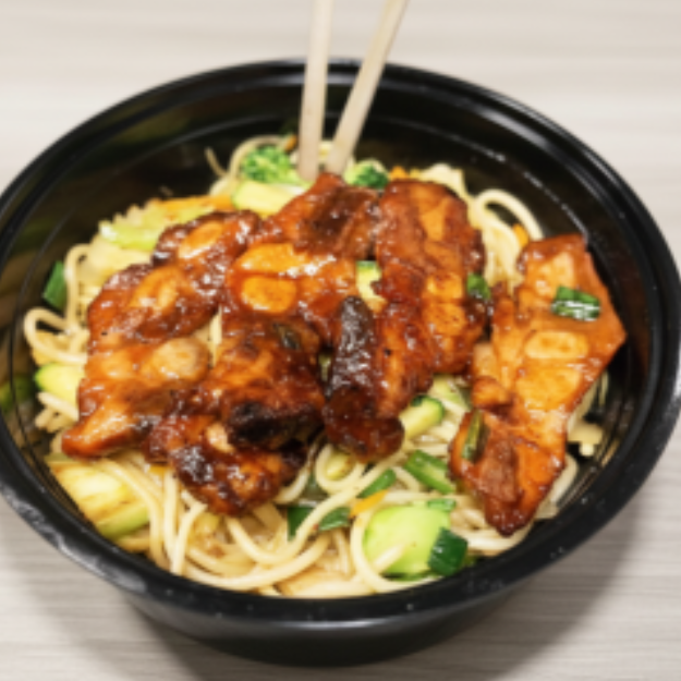 300 g de fideo salteado al wok, sin fondo, 5 pzas de costillas a la BBQ con brócoli, apio, zanahoria, calabaza y cebolla.