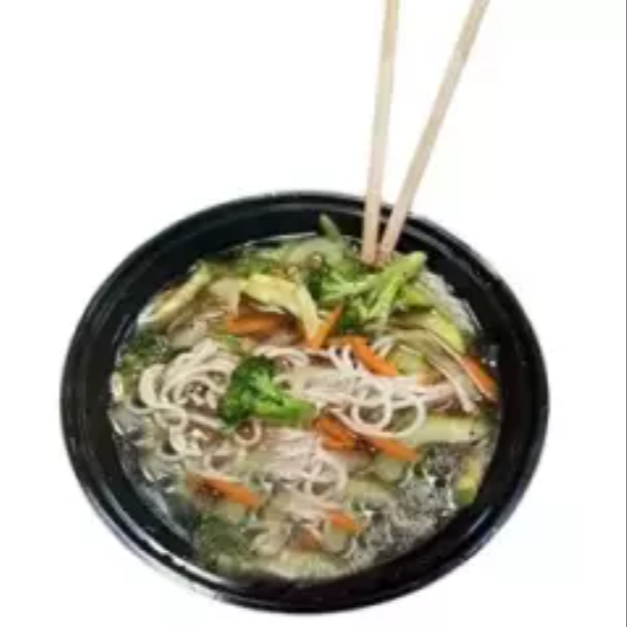 250 g De fideos, 8 pzas de chiken balls, medio huevo cocido, brocoli, apio, calabaza, zanahoria, cebolla y fondo especial de la casa.
