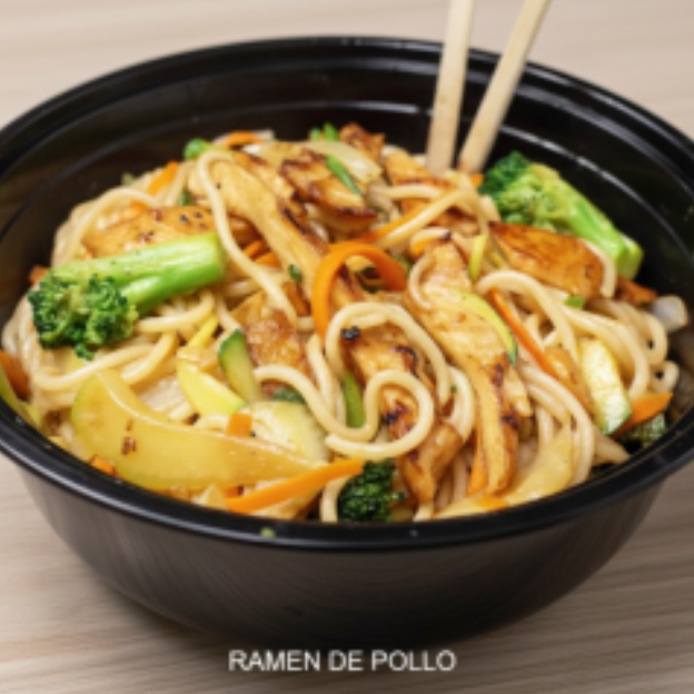 250 g De fideos, 100 g de pollo (peso crudo), medio huevo cocido, brócoli, apio, calabaza, zanahoria, cebolla y fondo especial de la casa.