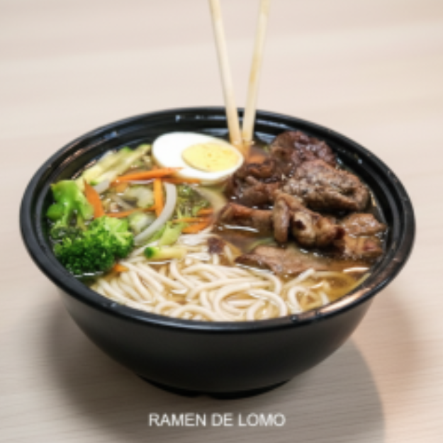 250 g De fideos, 100 g de sirloin corte fino (peso crudo), medio huevo cocido, brócoli, apio, calabaza, zanahoria, cebolla y fondo especial de la casa.