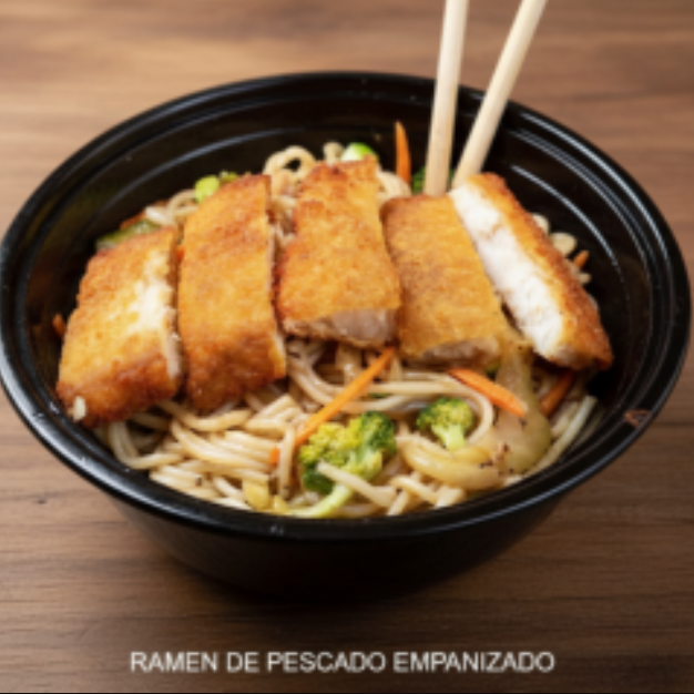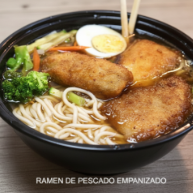 250 g De fideos, 5 pzas de pescado empanizado, medio huevo cocido, brocoli, apio, calabaza, zanahoria, cebolla y fondo especial de la casa.