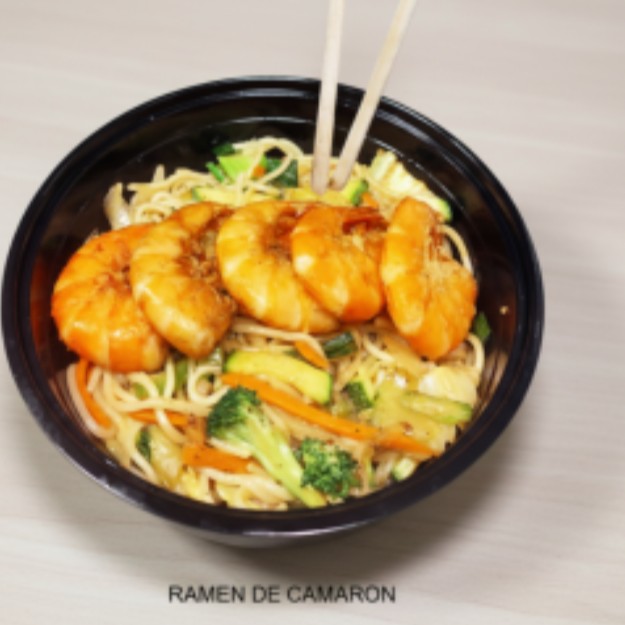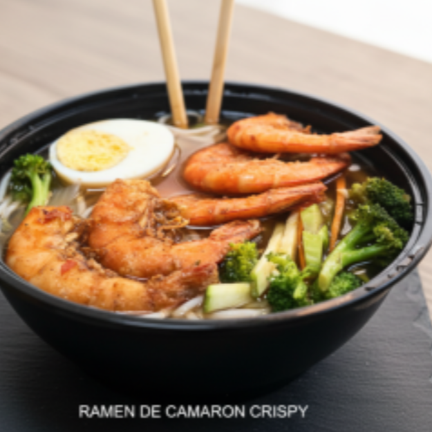 250 g De fideos, 5 pzas de camarón crispy, medio huevo cocido, brocoli, apio, calabaza, zanahoria, cebolla y fondo especial de la casa.
