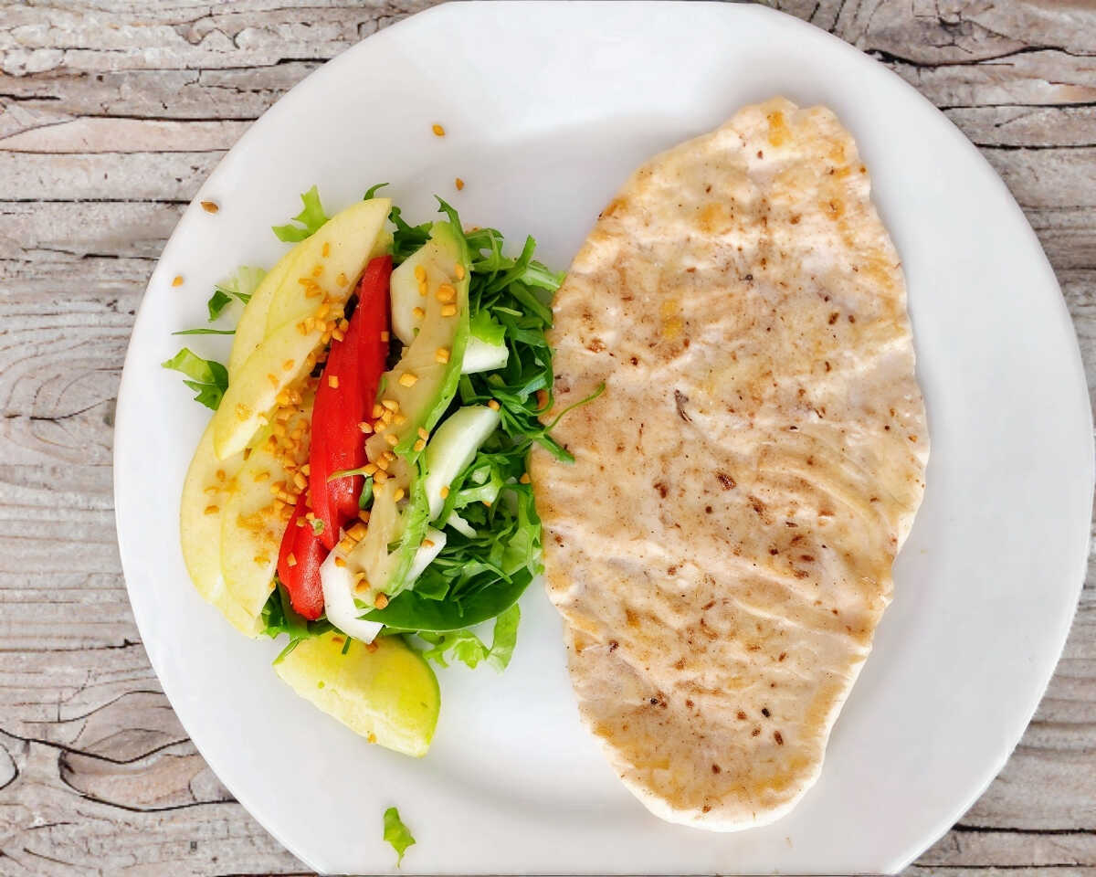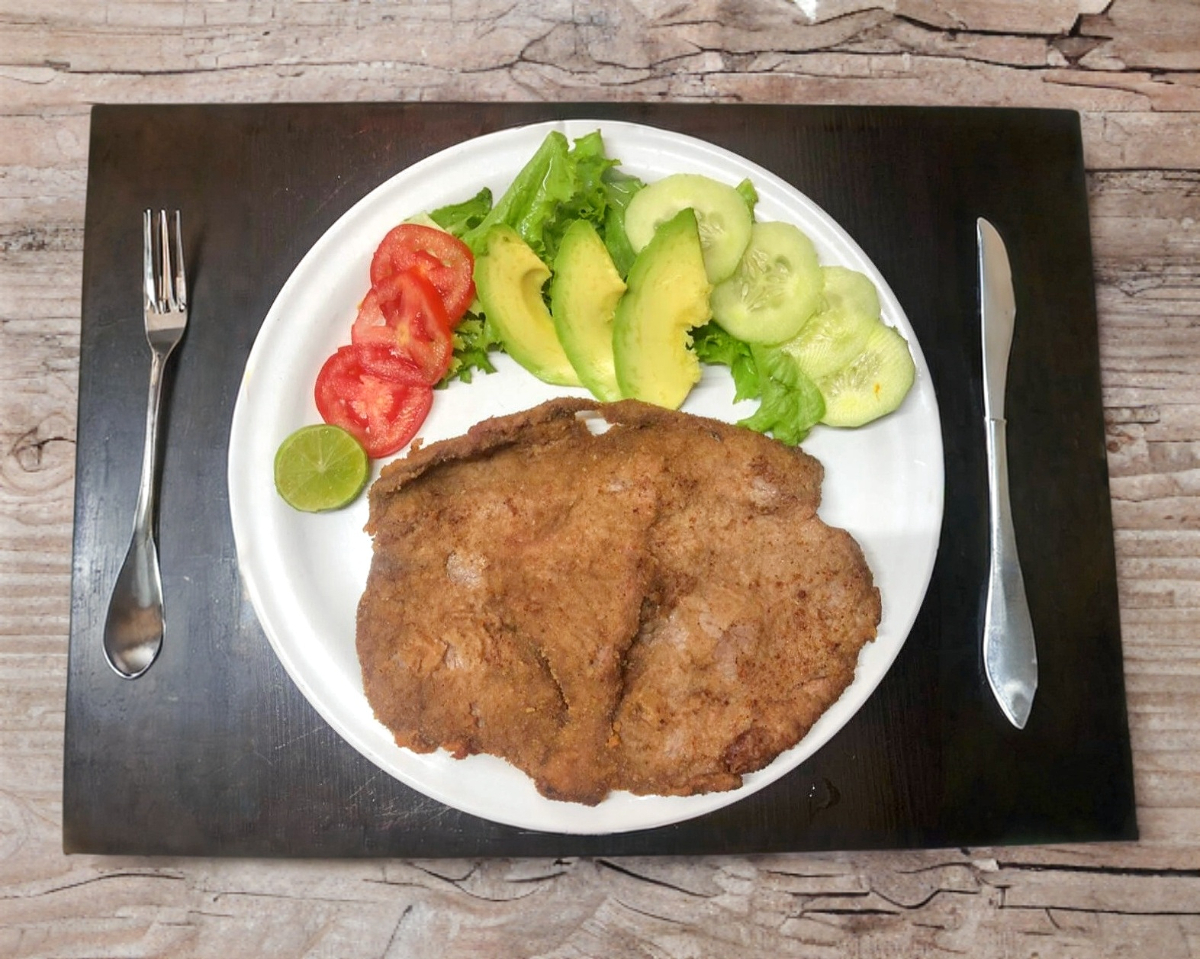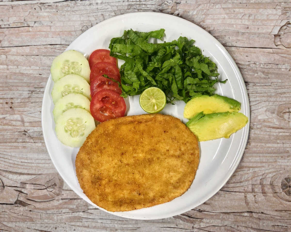 Milanesa de res empanizada y dorada. Acompañada de verduras o ensalada fresca