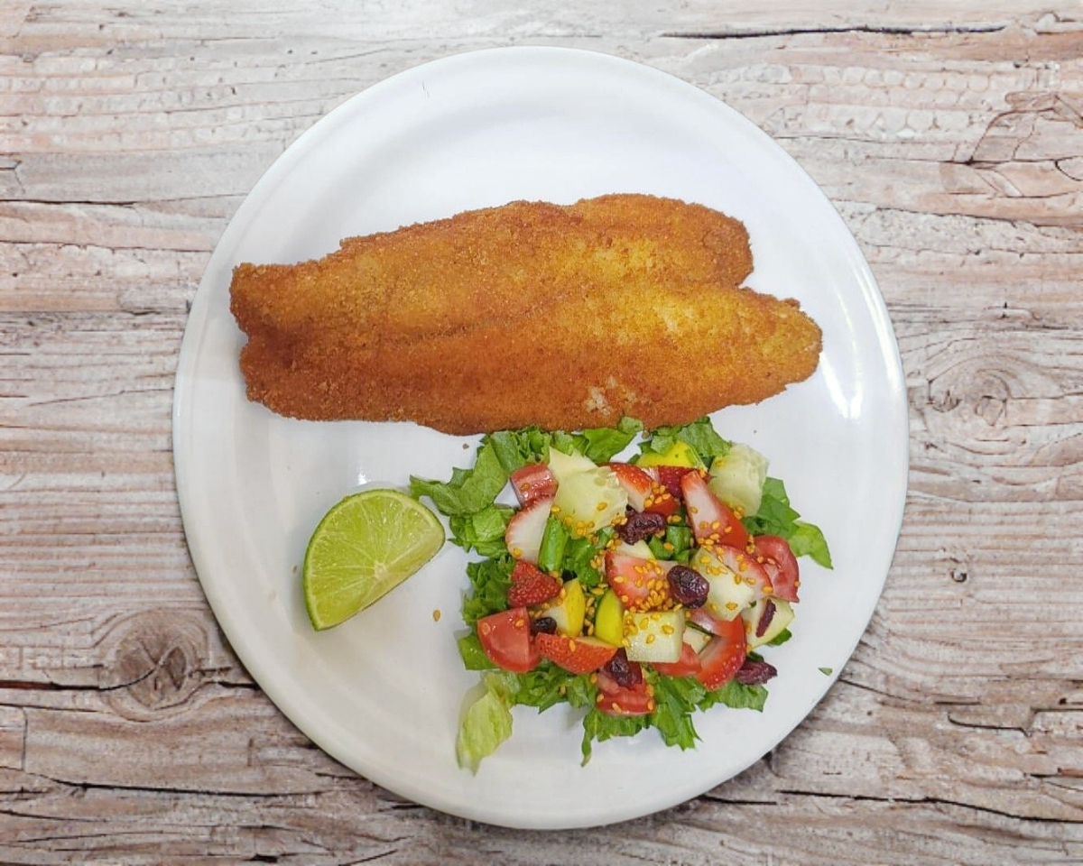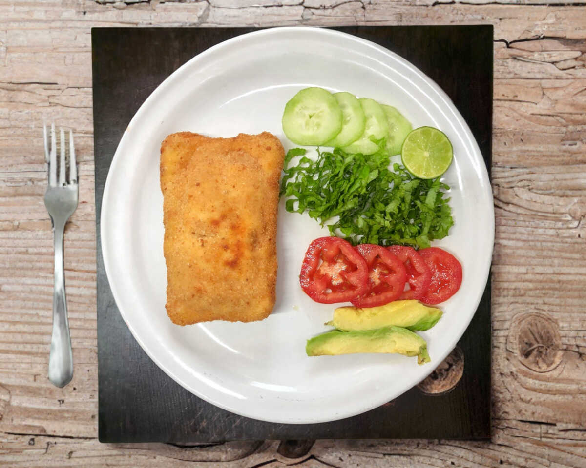 Filete de pescado, empanizado y frito hasta obtener una capa crujiente y dorada. Su carne suave y jugosa se combina perfectamente con el toque crocante del empanizado. Acompañado de una guarnición de verduras o ensalada fresca