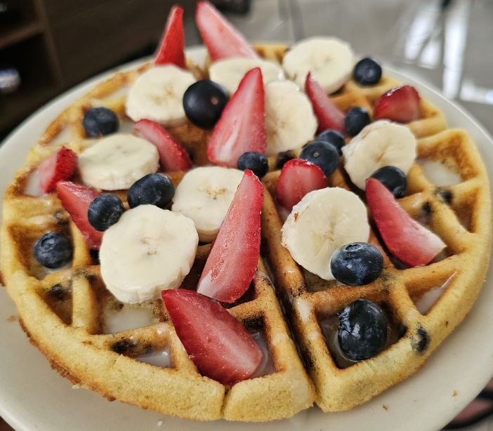 Waffle tradicional relleno de crema de queso, fresas, y trocitos de chocolate.