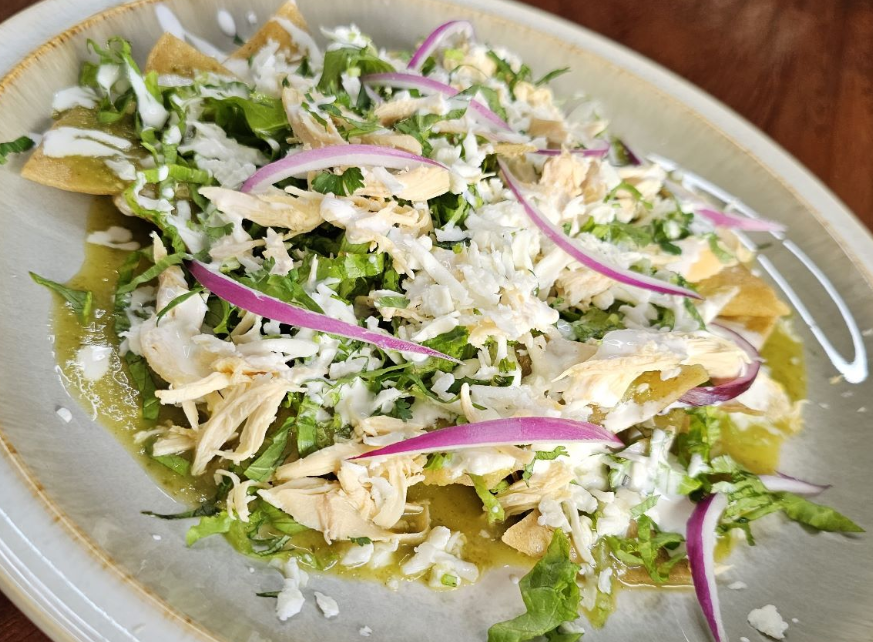 Con pollo deshebrado, bañados con nuestra inigualable salsa verde, crema, queso doble crema, cilantro y cebolla