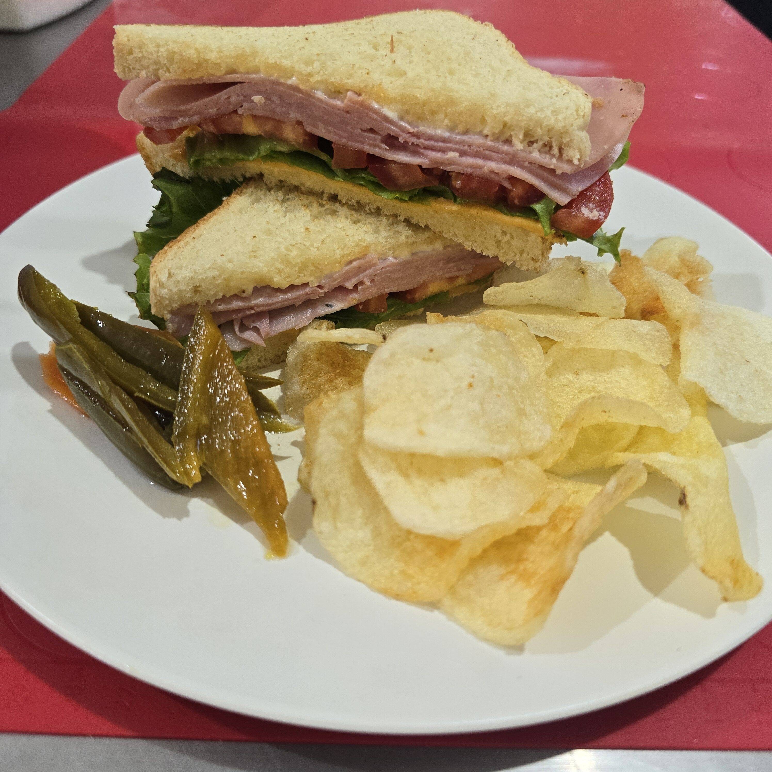 Delicioso sandwich de jamón con lechuga, jitomate, queso, y mayonesa, acompañándo de papas fritas.