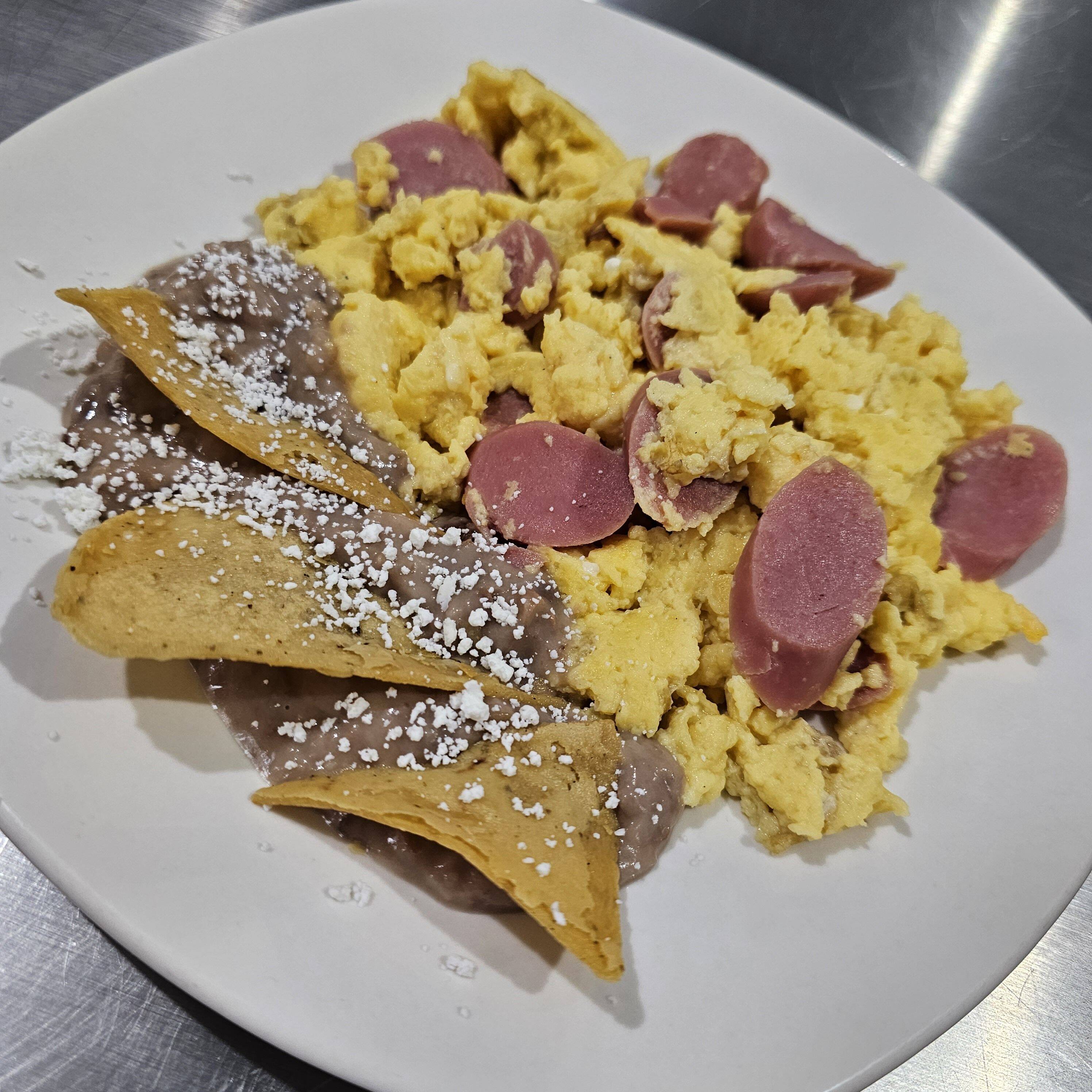 Huevos (3pz) revueltos con salchicha y frijoles refritos, acompañado de pan y totopos.