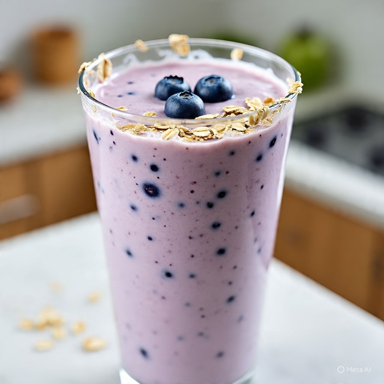 Delicioso batido con 25 gramos de Proteína, Yogurt natural, Blue Berry, Plátano, Avena y un toque de Miel orgánica.