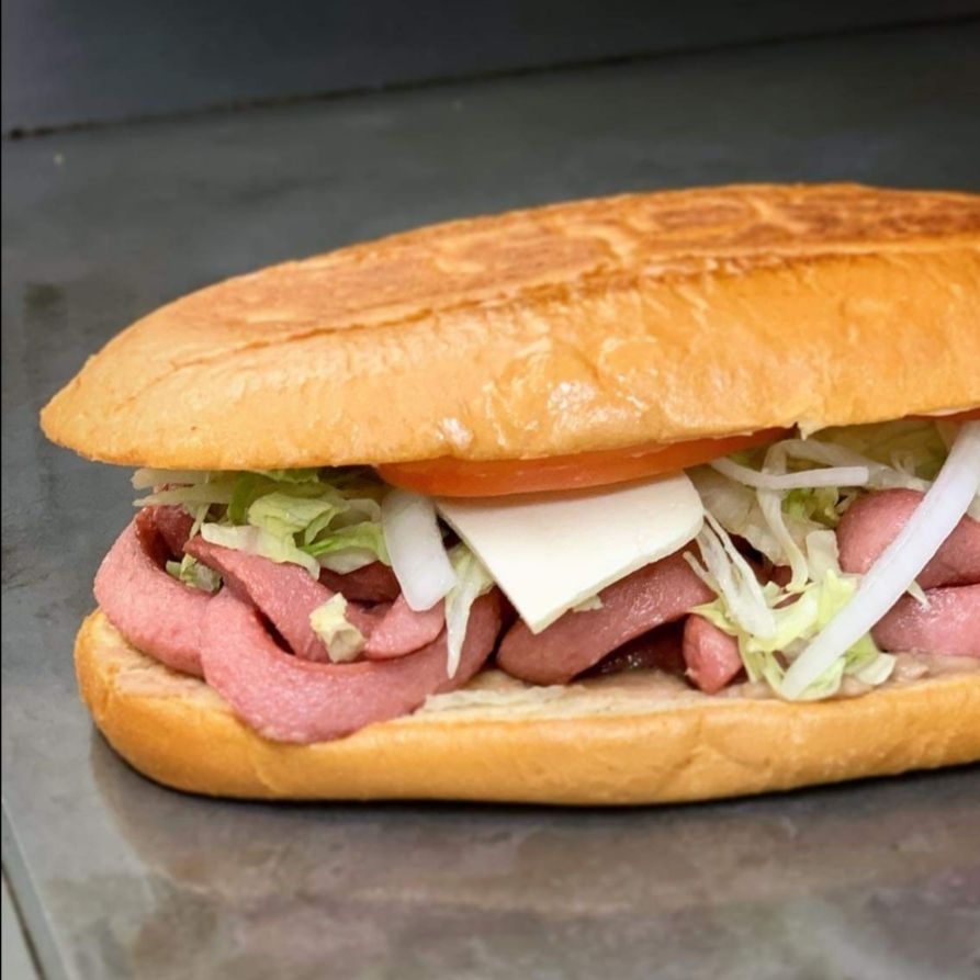 Sandwich con Jamón de pierna, queso panela, queso Gouda, jitomate, Lechuga, espinaca y aderezos, acompañado de papas Fritas.