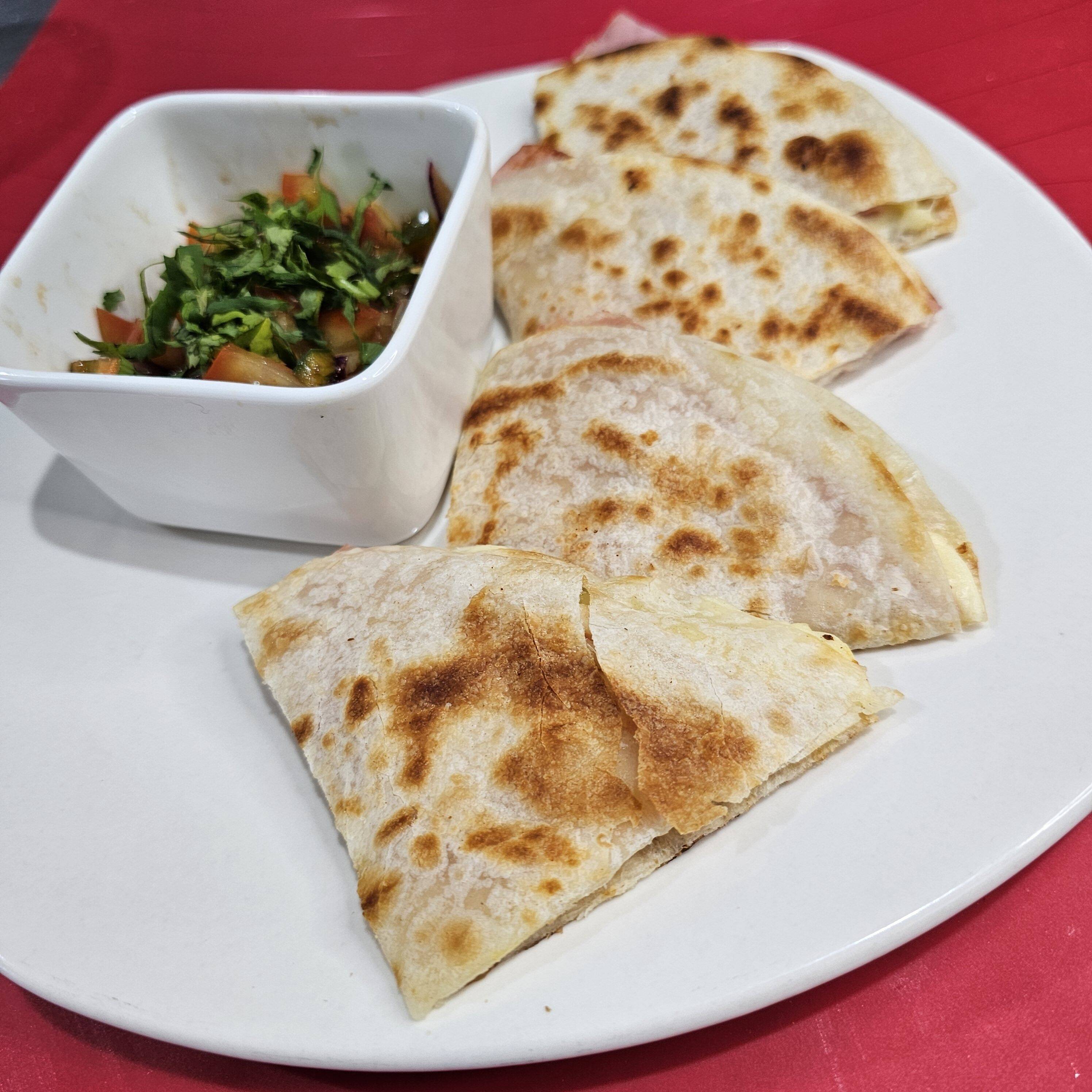 Sincronizada de jamón con quesillo, mayonesa y queso amarillo acompañada de pico de gallo