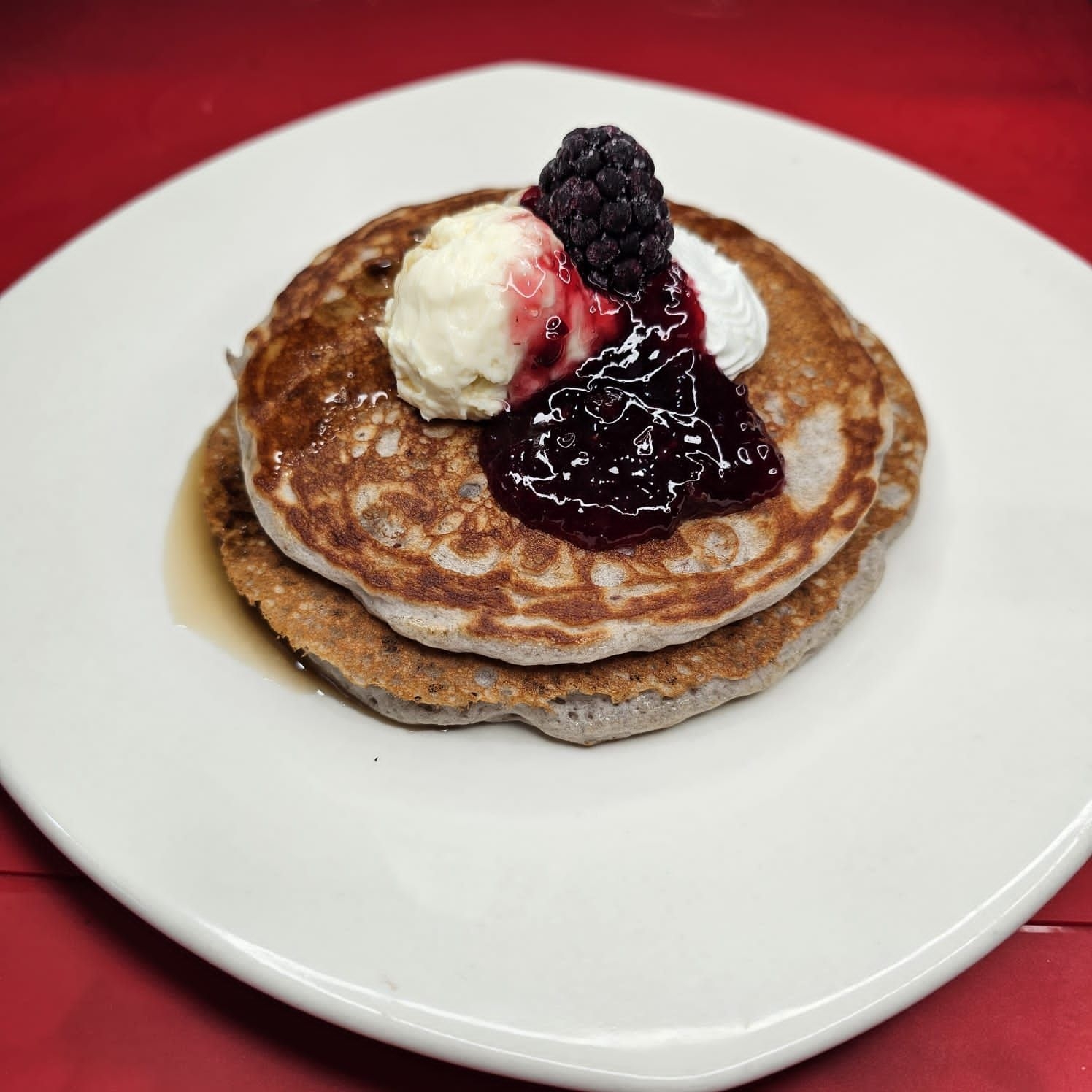 Waffle estilo belga de 18 cm con fruta de temporada, mantequilla, confit de frutos rojos y jarabe de maple.