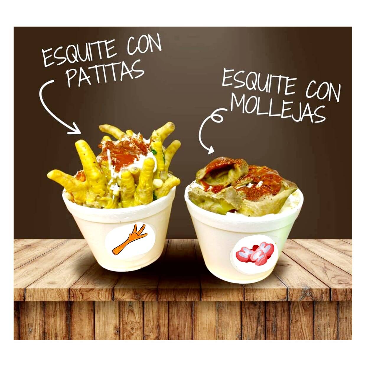 Esquites acompañados de patitos y/o mollejas de pollo, servidos con mayonesa, queso amarillo, queso rayado, limón y picante (valentina y/o piquin)