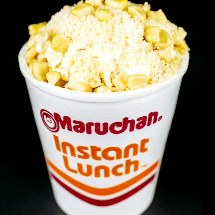 sopa instantánea acompañada de esquites, servidos con mayonesa, queso amarillo, queso rayado, limón y picante (valentina y/o piquin)