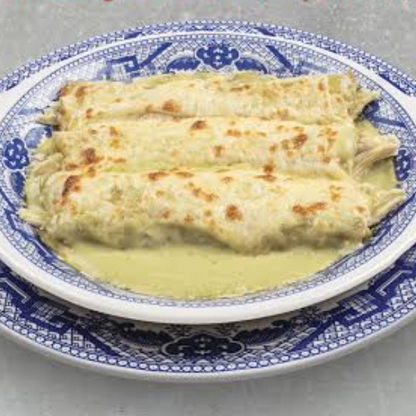 Rellenas de pollo o panela, bañadas en salsa verde y gratinadas con queso manchego