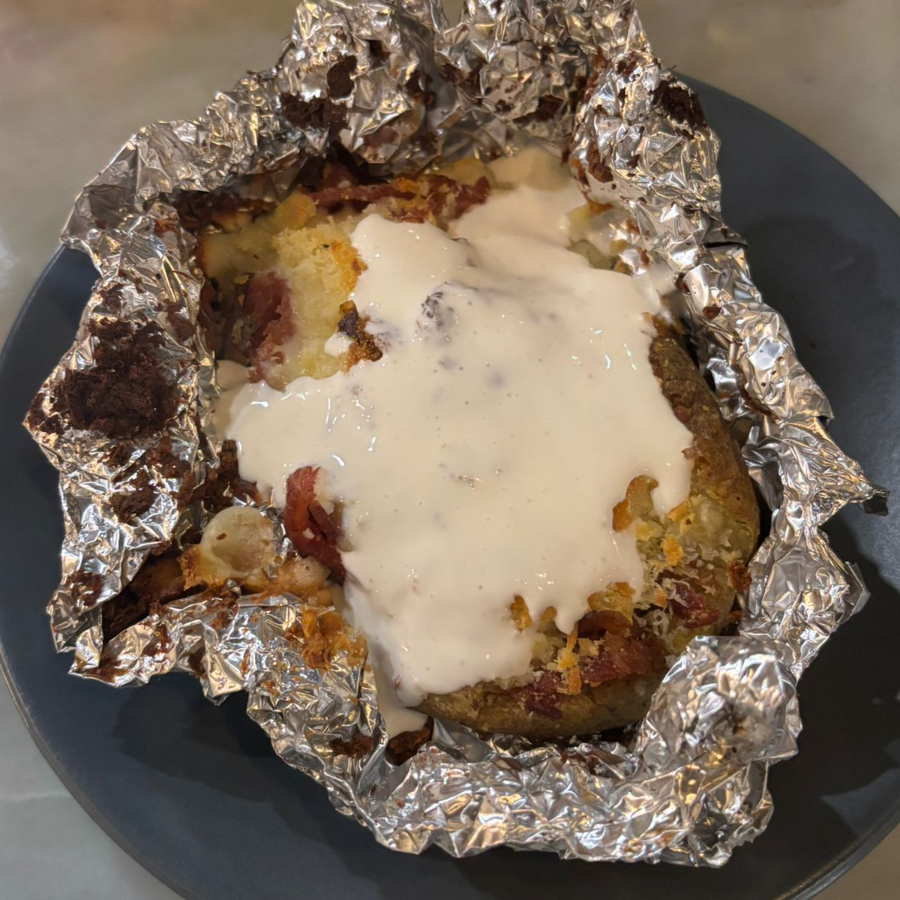 Papa al horno con tocino, crujiente por fuera, suave por dentro. Nuestra papa al horno se sirve generosamente con queso fundido, un toque de mantequilla, condimentos y TOCINO y topping de elección.