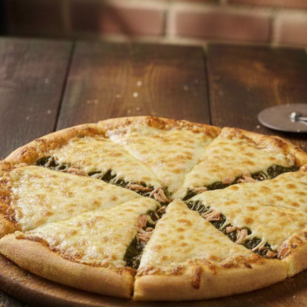 Pizza de mole verde, jugosos muslos de pollo, deshebrados guisados con mole hecho con hierbas frescas, semillas y especias.Elige el nivel de ahumado en tu pizza de mole verde que prefieras: suave y sutil para realizar los ingredientes, o intenso y robusto para un sabor más atrevido. Combinala con nuestras creaciones unicas de aderezos, cada mordida es una explosión de sabor y personalidad.