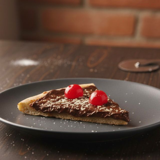 Rebanada de pizza de chocolate: Base crujiente, con una cubierta de lechera y coronada con una capa de suave chocolate untable especialidad de la casa. Dulce, irresistible y divertida.