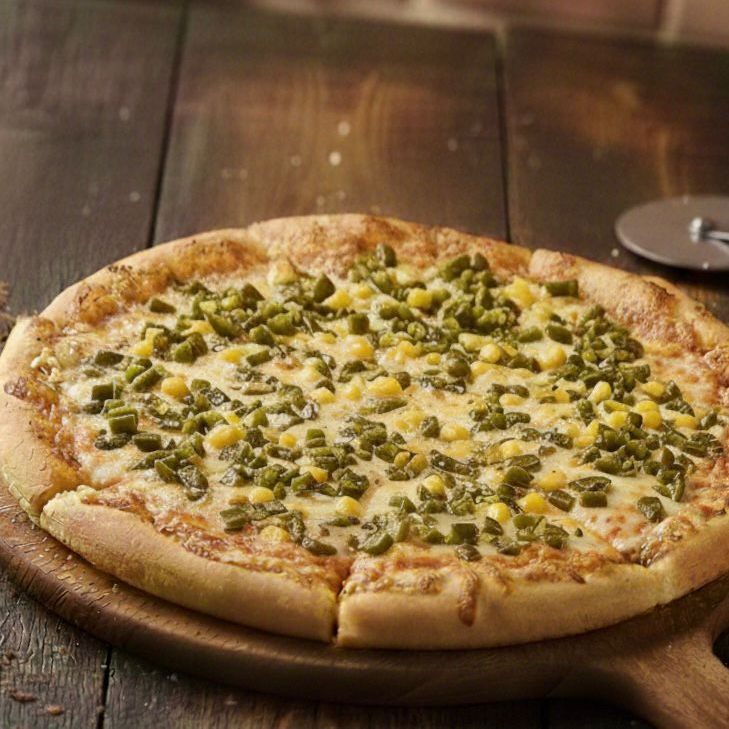PIZZA DE RAJAS DE CHILE POBLANO, Salteadas con cebolla y elote. Elige el nivel de ahumado que prefieras: suave y sutil para realzar los ingredientes, o intenso y robusto para un sabor mas atrevido. Combinala con nuestras creaciones únicas de aderezos, cada mordida es una exploción de sabor y personalidad.